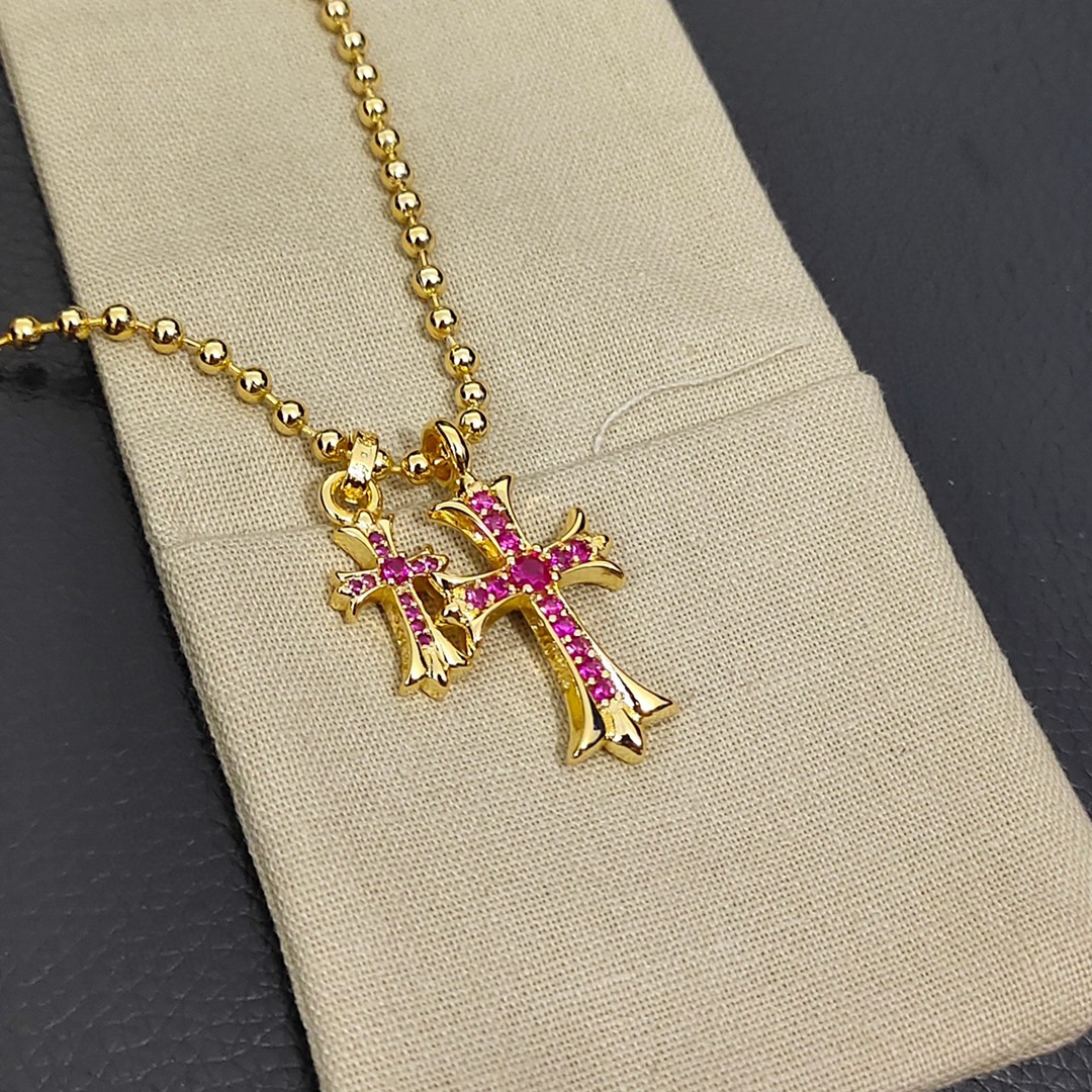Chrome HeartDouble Crucifix Pink Diamond Light Beads Necklace‌– TFYP Comcany